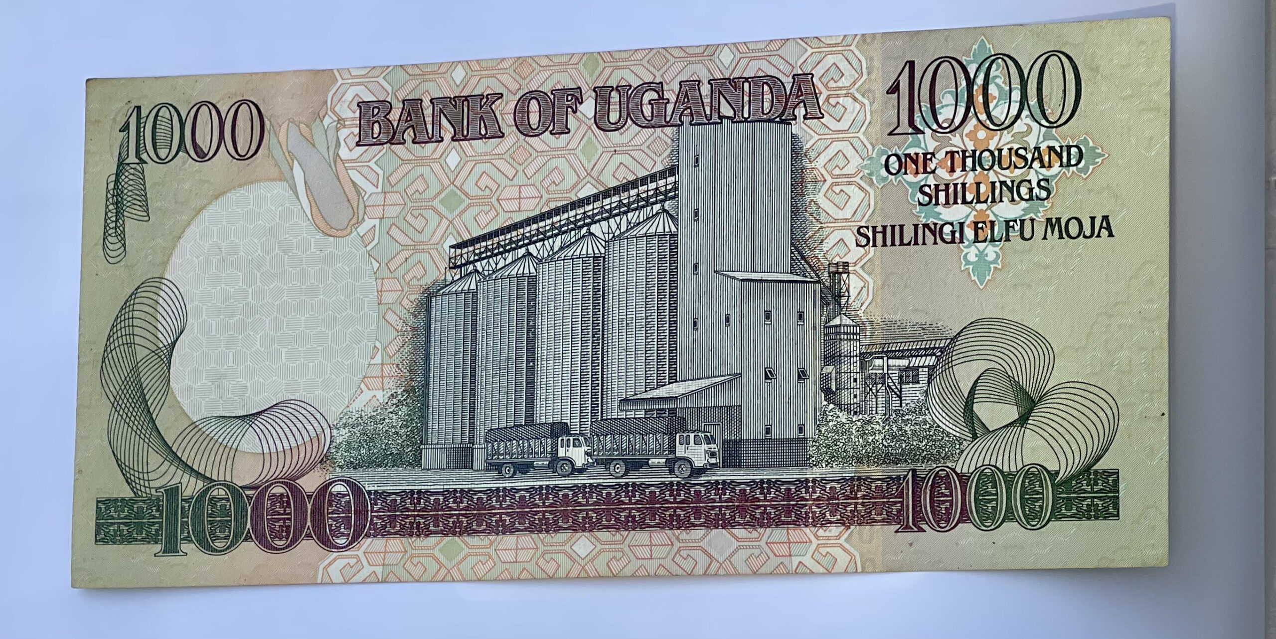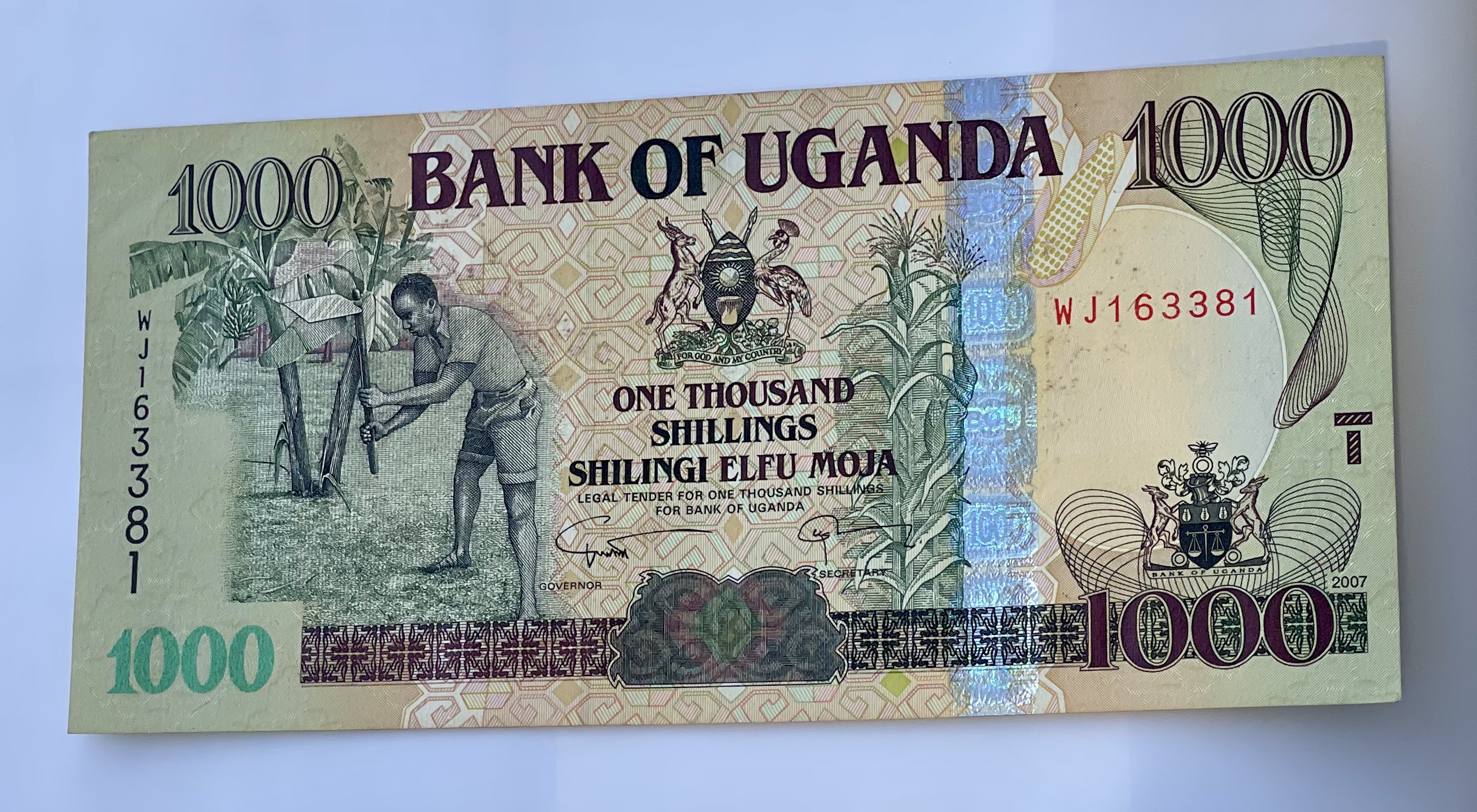 2005 Uganda 1000 Shilingi Elfu Moja Banknote. Serial Number: WJ163381