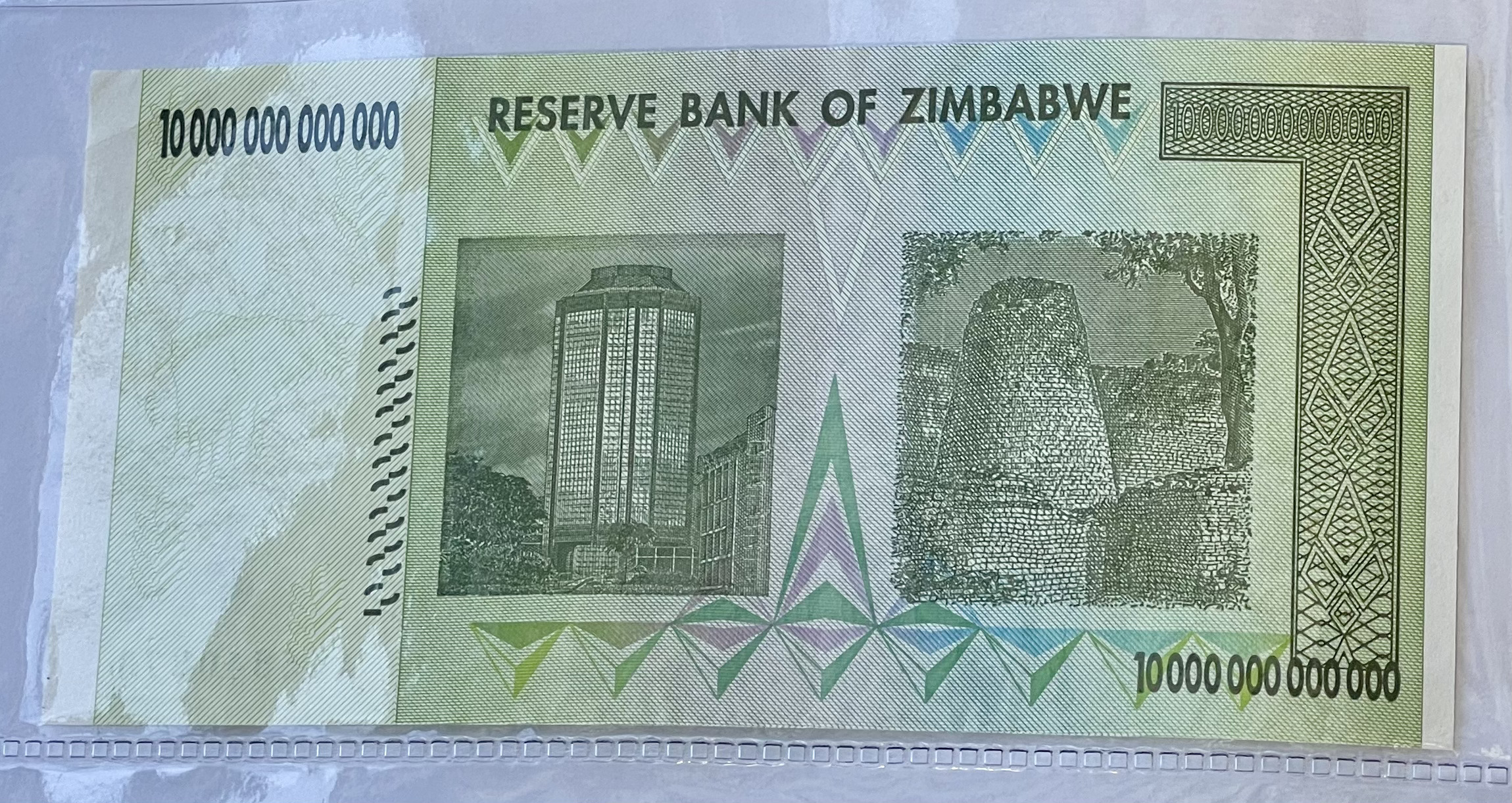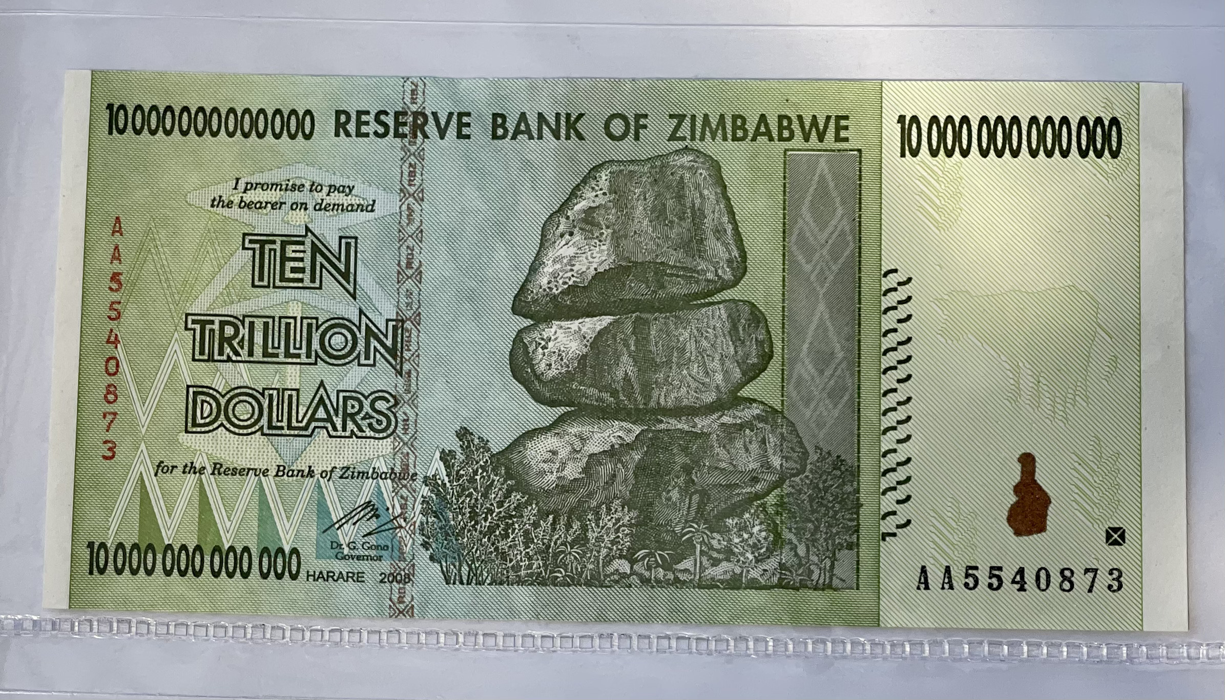 2008 Zimbabwe 10 Trillion Dollars Banknote. Serial Number: AA5540873