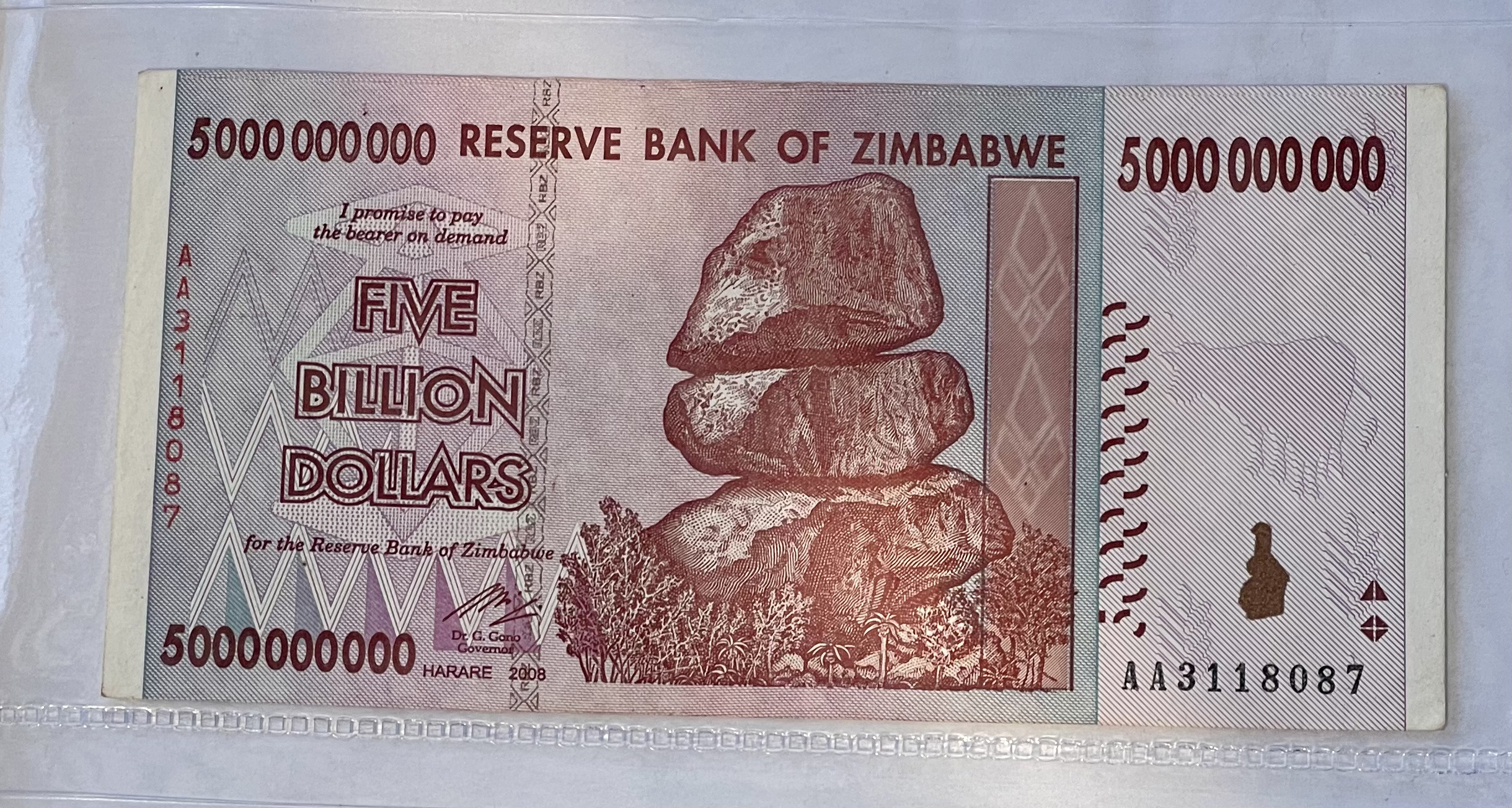 2008 Zimbabwe 5 Billion Dollars Banknote. Serial Number: AA3118087