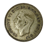 The obverse of the coin shows the bare (uncrowned) head of King George VI facing left. Below the neck truncation in small letters, the artist’s initials HP (for [Thomas] Humphrey Paget). Around, the monarch’s legend: GEORGIVS VI D : G : BR : OMN : REX FIDEI DEF.. Translated from Latin: George the Sixth, by the Grace of God, King of all the Britains, Defender of the Faith.