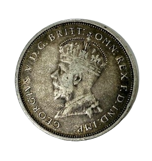 The obverse has a shortened version of the crowned effigy of King George V, facing left (his portrait by Sir Edgar Bertram Mackennal); the King is wearing the Imperial Crown and the ermine Robe of State. The artist’s initials are not displayed. Around, the monarch’s legend GEORGIVS V D. G. BRITT: OMN: REX F. D. IND: IMP:. Translated from Latin: George the Fifth, by the Grace of God, King of all the Britains, Defender of the Faith, Emperor of India.