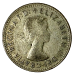 Pre-decimal silver coin featuring the iconic Merino ram’s head on the reverse and Queen Elizabeth II’s first portrait by Mary Gillick on the obverse.