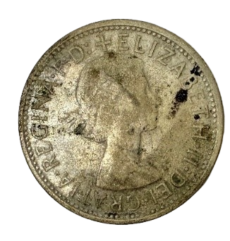 Pre-decimal silver coin valued at two shillings (one-tenth of a pound), featuring the updated 1912 Australian Coat of Arms on the reverse and the young Queen Elizabeth II’s first portrait by Mary Gillick on the obverse.